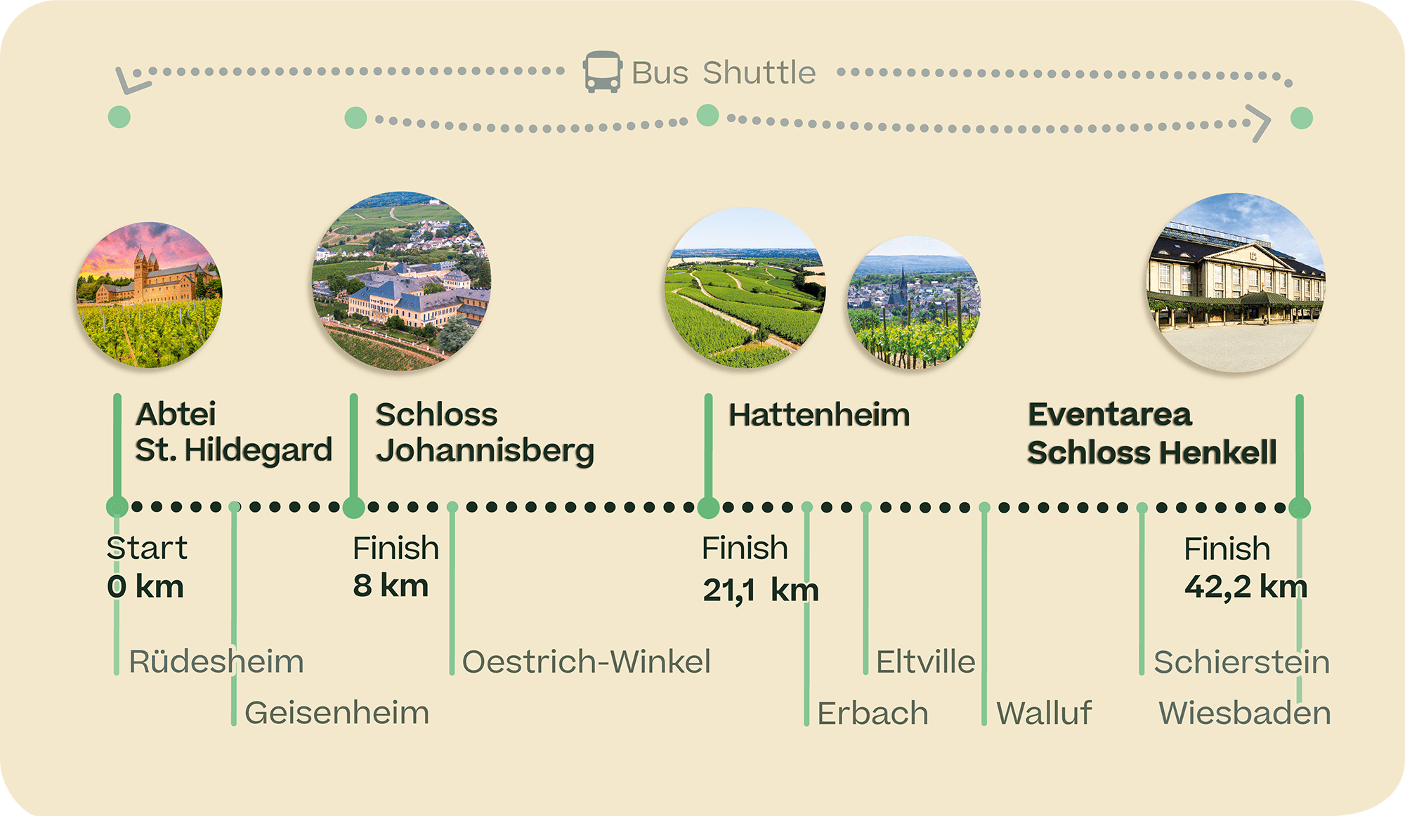 Départ et arrivée au Schloss Henkell (Château Henkell) :Une navette t’emmène au départ à Rüdesheim à Abtei St. Hildegard (l’Abbaye Sainte-Hildegarde). En groupes de départ, tu cours avec le Niederwalddenkmal dans le dos, les vignes à gauche et le Rhin à droite. Sur le parcours, tu passes Geisenheim et le chemin te mène à l’arrivée du 8 km au Schloss Johannisberg (Château Johannisberg). En passant par Oestrich-Winkel, la vue s’ouvre sur Wiesbaden et tu atteins Schloss Vollrads (Château Vollrads). Les coureurs du semi-marathon atteignent l’arrivée après Hattenheim. Comme les coureurs de courte distance, ils reviennent en navette au Schloss Henkell (Château Henkell) pour célébrer avec du crémant et des délices régionaux. Pour les coureurs du marathon, le parcours se poursuit via Erbach jusqu’à Eltville am Rhein, à travers Walluf et à plat le long des berges du Rhin jusqu’au Schiersteiner Hafen. En traversant le parc de Biebrich (Château de Biebrich), la montée finale mène à l’Ehrenhof du Schloss Henkell (Château Henkell).